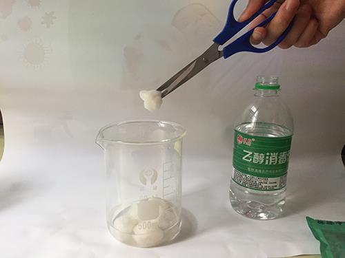 剪脫脂棉 用剪刀將脫脂棉裝入密封良好的容器內,最好是玻璃材質的瓶子。取出75%酒精(推薦漓峰牌75%乙醇消毒液)。